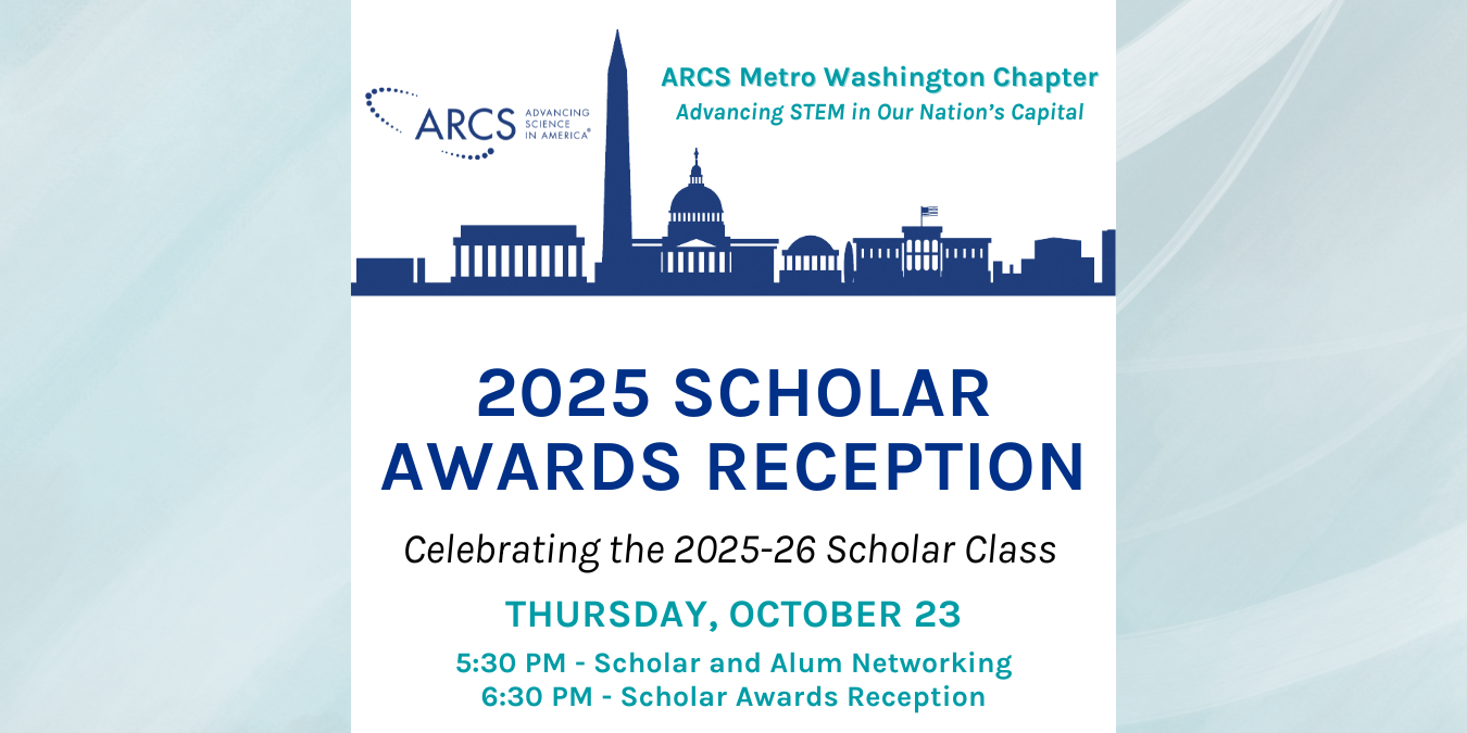Washington, D.C. (August 15, 2025) - ARCS Foundation Metropolitan Washington Chapter (ARCS MWC) will host its 56th annual Scholar Awards Reception (SAR) at 6:30pm on Thursday, October 23, 2025, in The Great Hall and the Fred Kavli Auditorium at The National Academy of Sciences in Washington, DC. This premier event will honor...
